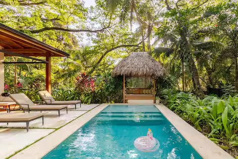 This villa has a salt water pool, large pampering spaces that blend the outdoor and indoor together, collection of arts from around the world, 3 masters each with its distinct design, a TV gallery space, a chef’s hi-end kitchen with absolutely everything one can dream of for hosting and cooking! An open space, bright living area and huge lush tropical garden that surrounds the villa for a great local animal watching!